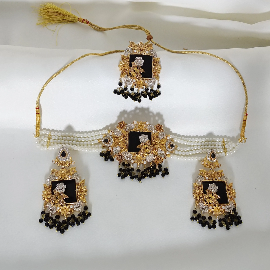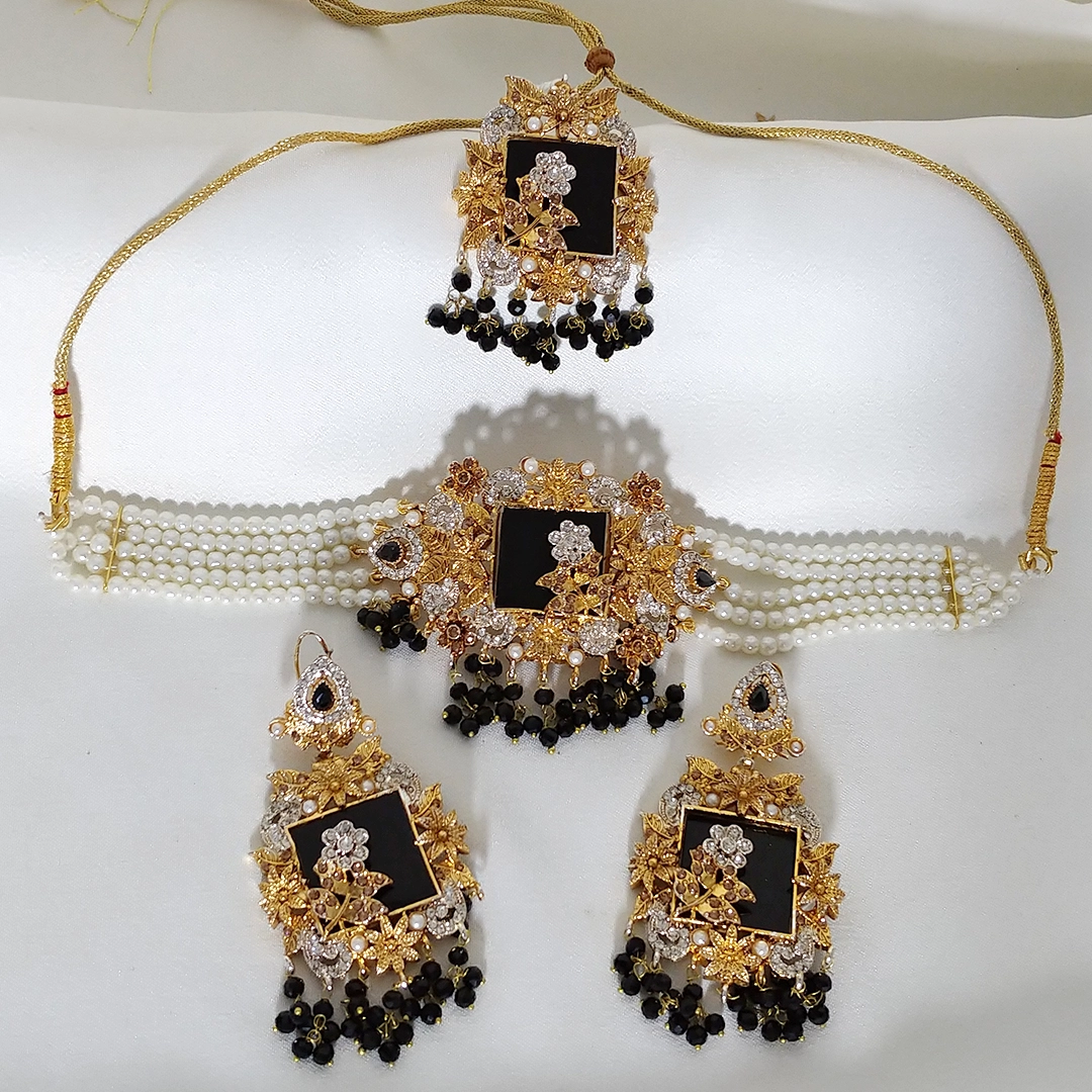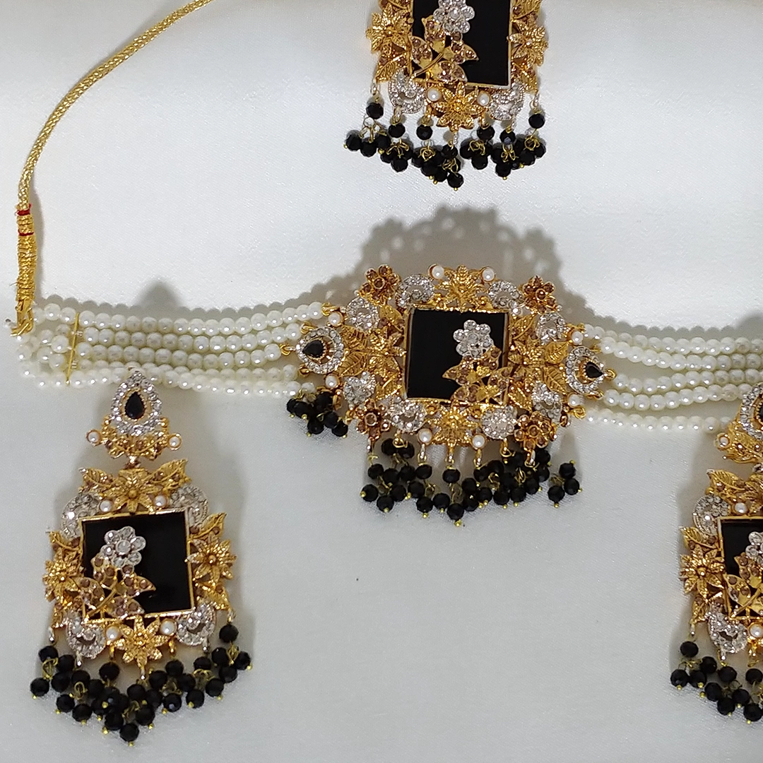 | 4 Piece Stylish Look Choker Necklace Set with Pearl and Sheesha Kundan. White Golden and Black Colour Combination. Use in Wedding and Parties. |